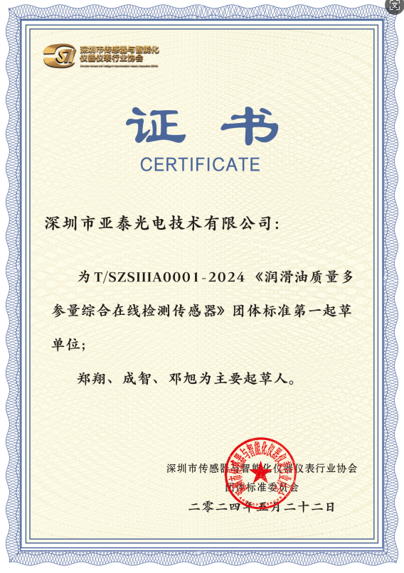 亚泰光电首页 >> 走进亚泰 >> 亚泰光电资质荣誉 >> 企业资质 >> 全国第一个油液传感器团体标准