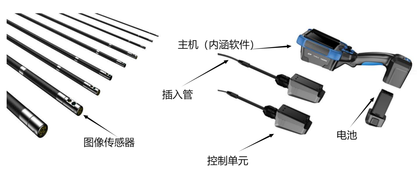 包含控制单元、图像传感器、插入管及其配套的软件,软件安装在控制单元内