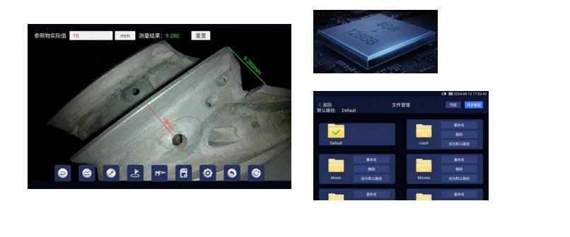 7.强大的储存功能——自带128GB 内部存储 + 64GU 盘,存储空间满足存储更多照片、视频的需求,在设备 操控上也将得到更加酣畅的体验;对大量存储的图片视频可进行分类管理并对图片可放大、缩小、还原、删除、涂鸦,对比 测量等操作。